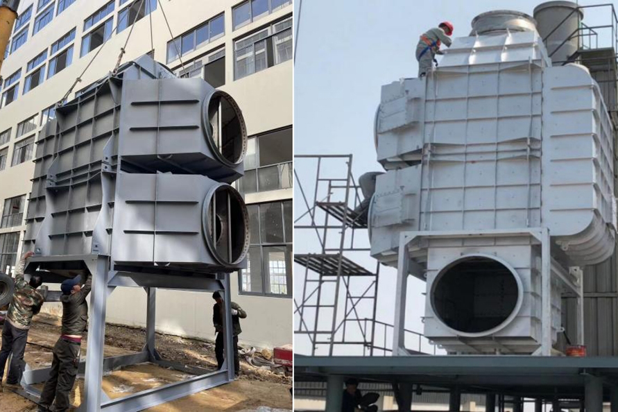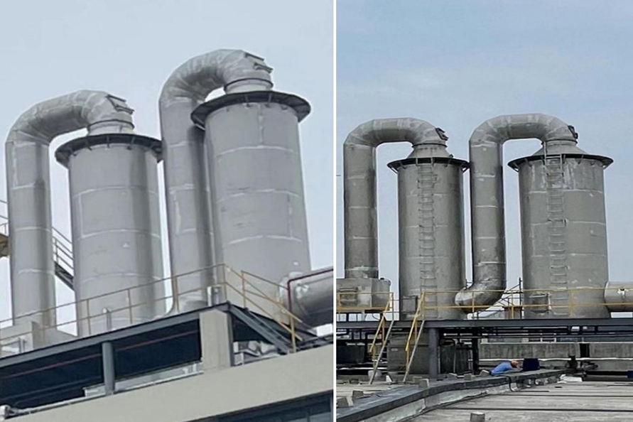 在磷化工、石墨、有色冶煉等行業(yè),生產(chǎn)排放的飽和濕煙氣與低溫環(huán)境空氣接觸時(shí),在煙氣溫度下降過(guò)程中,煙氣中的水蒸氣過(guò)飽和凝結(jié),凝結(jié)水滴折射和散射光線,使煙羽呈白色或灰色,稱(chēng)為濕煙羽。由于冬季溫度較低,相關(guān)問(wèn)題的環(huán)保投訴較多。那么,有哪些種煙氣脫白技術(shù)?各種煙氣脫白的技術(shù)原理是怎樣的?1、冷凝相變煙氣脫白技術(shù)冷凝相變煙氣脫白原理為:煙氣經(jīng)濕法脫硫后,含濕量上升,為B狀態(tài),進(jìn)入換熱消霧模塊后。干態(tài)空氣A入換熱消霧模塊兩者交換后,A溫度上升,含濕量不變,相對(duì)濕度降低,處于C。B煙氣,溫度降低,相對(duì)濕度不變,含濕量降低,液滴析出,轉(zhuǎn)為D。D和受熱C流出換熱消零模塊,在氣室中混合,使D溫度下降,濕度降低:C溫度上升,相對(duì)濕度上升,兩種狀態(tài)的煙氣混合,最終達(dá)到F狀態(tài),AF連線始終處于不飽和狀態(tài),因此,不會(huì)出現(xiàn)可見(jiàn)白煙或霧氣團(tuán)。可以看出,冷凝混風(fēng)技術(shù)是煙氣脫白的較好技術(shù)路線,特別是在北方寒冷地區(qū),單純的煙氣再熱很難消除煙囪白煙。2、低電耗離子束煙氣脫白技術(shù)低電耗離子束煙氣脫白原理為:高速電子射流擊穿煙氣,產(chǎn)生正負(fù)離子體基團(tuán),煙氣中氣溶膠、飽和水滴、微小顆粒物在離子束的撞擊下,不斷發(fā)生凝聚效應(yīng),顆粒物和水滴快速凝聚成團(tuán),在重力作用下,落到離子束除變器底部流入脫硫塔或廢水收集池,達(dá)到降解顆粒物,氣溶膠和水零的目的。廢氣中的氨氧化物,由高速電子束提供能量,快速與氨氣發(fā)生還原反應(yīng),生成副產(chǎn)物水。低電耗離子束煙氣脫白優(yōu)點(diǎn):1.放電產(chǎn)生的離子體中,電子能量高,幾乎可以和所有的惡臭氣體分子作用。2.反應(yīng)快,不受氣速限制。采用防腐蝕材料。3.用電成本低,操作極為簡(jiǎn)單,無(wú)需派專(zhuān)職人員看守,基本不占用人工費(fèi)。4.設(shè)備啟動(dòng)、停止十分迅速,隨用隨開(kāi),不受氣溫的影響。